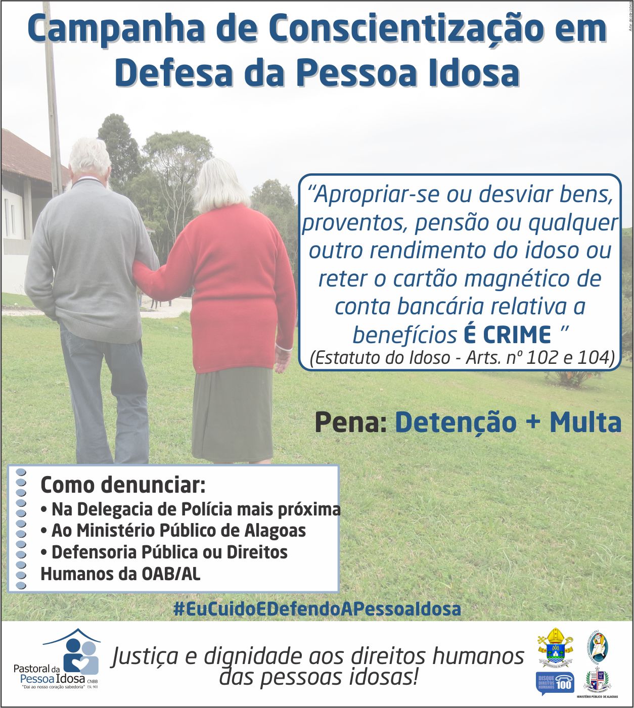 A Pastoral da Pessoa Idosa do estado de Alagoas está lançando uma campanha de conscientização em defesa da Pessoa Idosa, com o objetivo de informar e diminuir os casos de abuso financeiro sofrido pelos idosos. Em recente viagem para Maceió/AL, a coordenadora nacional da PPI, Irmã Terezinha Tortelli, ouviu casos contados pelos líderes, relatando uma série de abusos e violações que as pessoas idosas estão sofrendo. A campanha é uma iniciativa do coordenador estadual, Crismédio Neto.