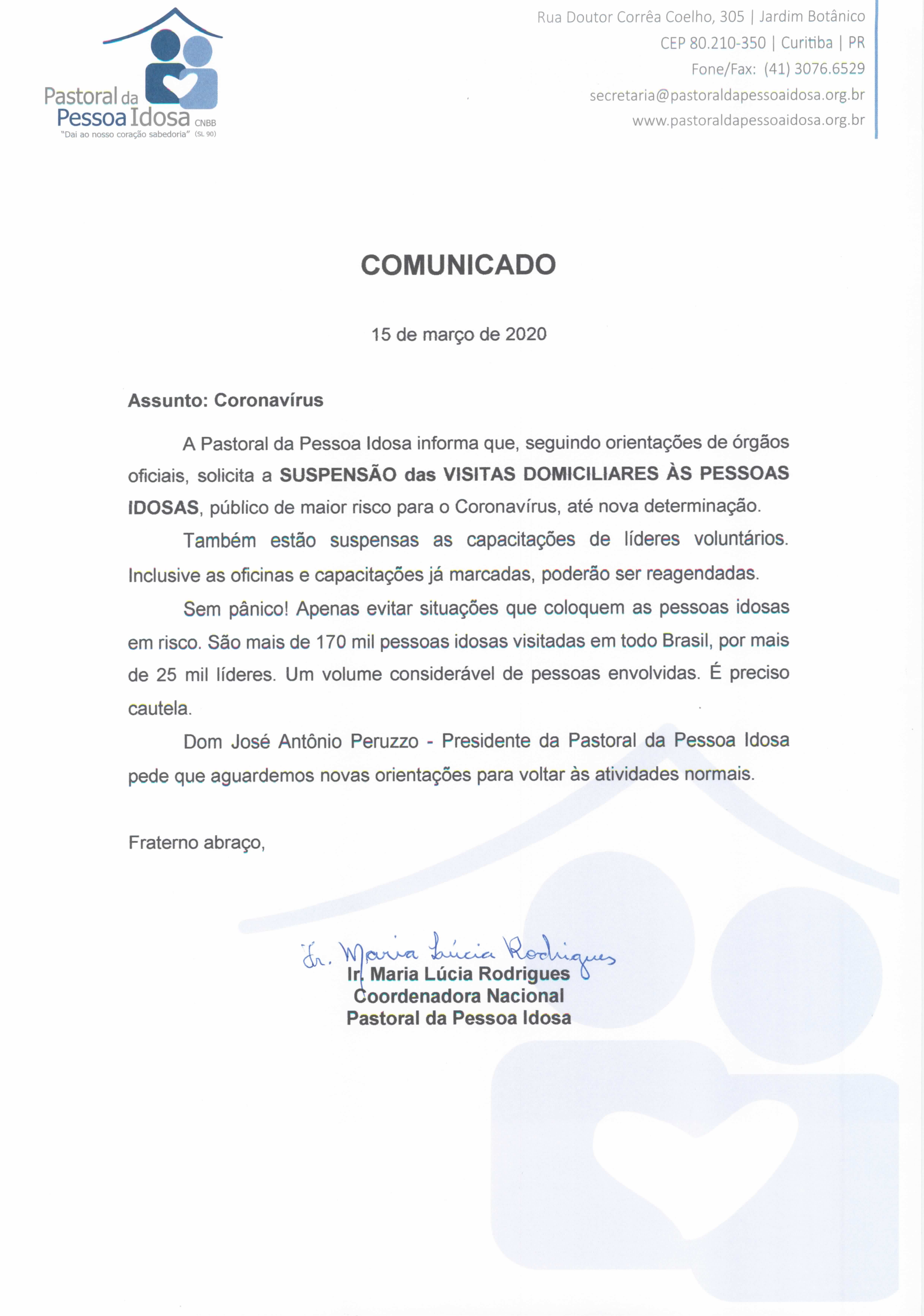 No dia 04 de Março de 2020 aconteceu em Curitiba - PR a Assembléia Eletiva da Pastoral da Pessoa Idosa onde foram eleitos os novos membros da Diretoria. Dom José Antônio Peruzzo foi reconduzido ao cargo de Presidente da Instituição e Ir. Maria Lúcia Rodrigues assume como nova Coordenadora Nacional da Pastoral da Pessoa Idosa.
