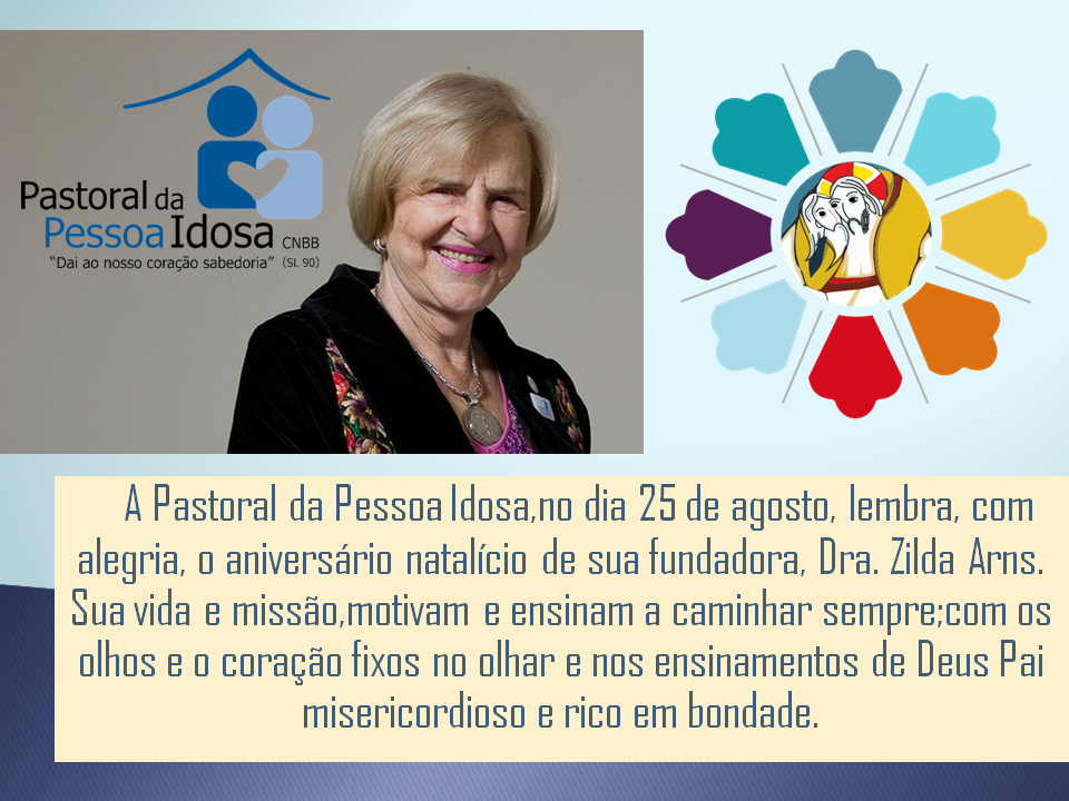 Neste 25 de agosto de 2016, a fundadora da Pastoral da Pessoa Idosa, estaria completando 82 anos de uma vida. Durante toda sua vida, se dedicou à construção de uma sociedade mais justa, fraterna e saudável, especial atenção à pessoa idosa e a criança. Em 05 de novembro de 2004, discreta e humildemente, nascia a Pastoral da Pessoa Idosa, ou simplesmente PPI, por iniciativa da Dra. Zilda, uma incansável mulher, de muita fé, que sempre muito forte e cheia de entusiasmo, animou milhares de voluntários até a sua morte, em 12 de janeiro de 2010, no Haiti.
