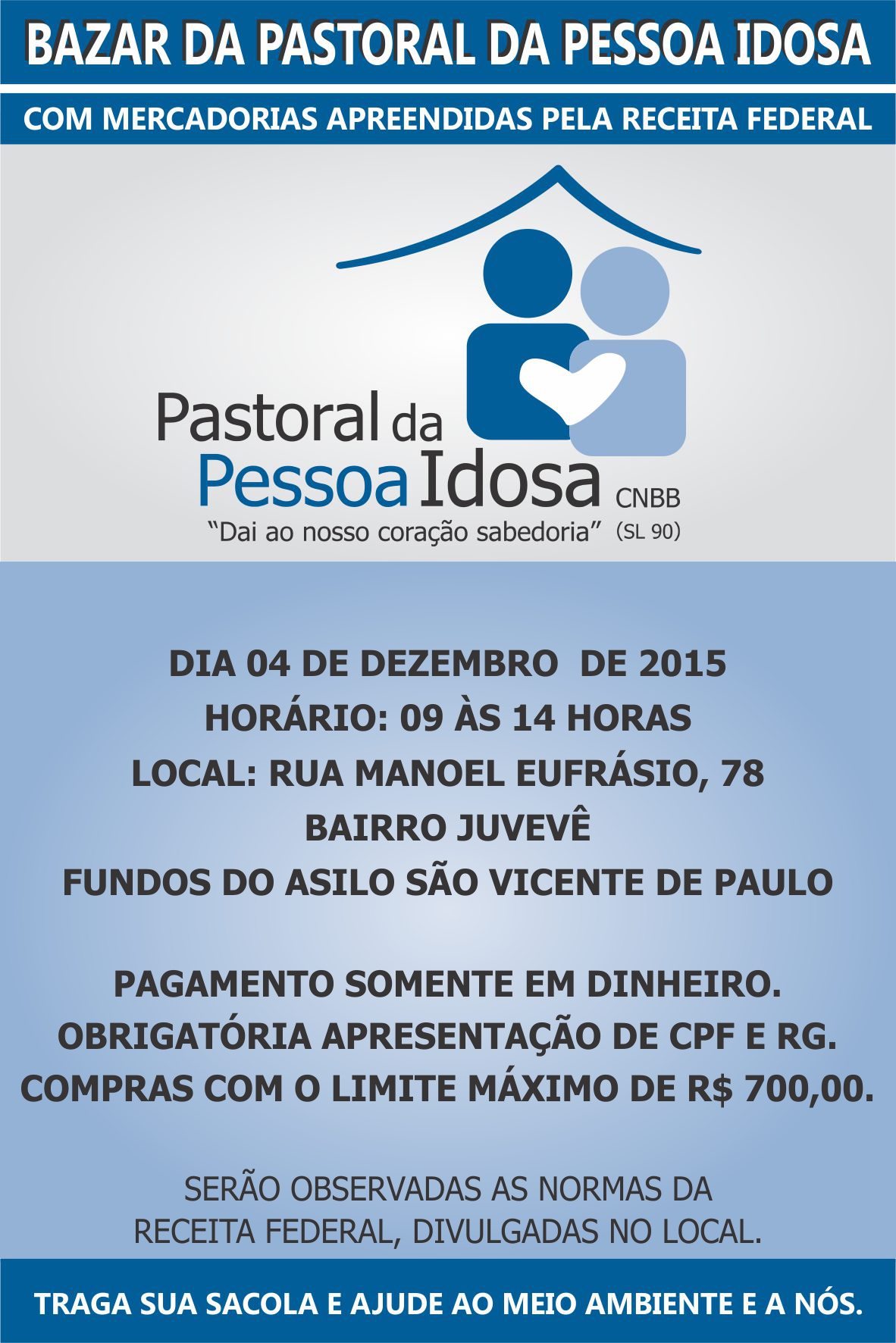 A Pastoral da Pessoa Idosa (PPI), foi fundada em 05 de novembro de 2004 por dra. Zilda Arns Neumann, respondendo ao fenômeno do envelhecimento populacional brasileiro está participando do "Dia de Doar" 2015. O Dia de Doar, realizado no dia 01 de dezembro, é uma campanha surgida nos Estados Unidos no ano de 2012 e vem se espalhando pelo mundo, já alcançando mais de 80 países, incluindo o Brasil. O objetivo da campanha é simples: promover a solidariedade e a cultura de doação.
