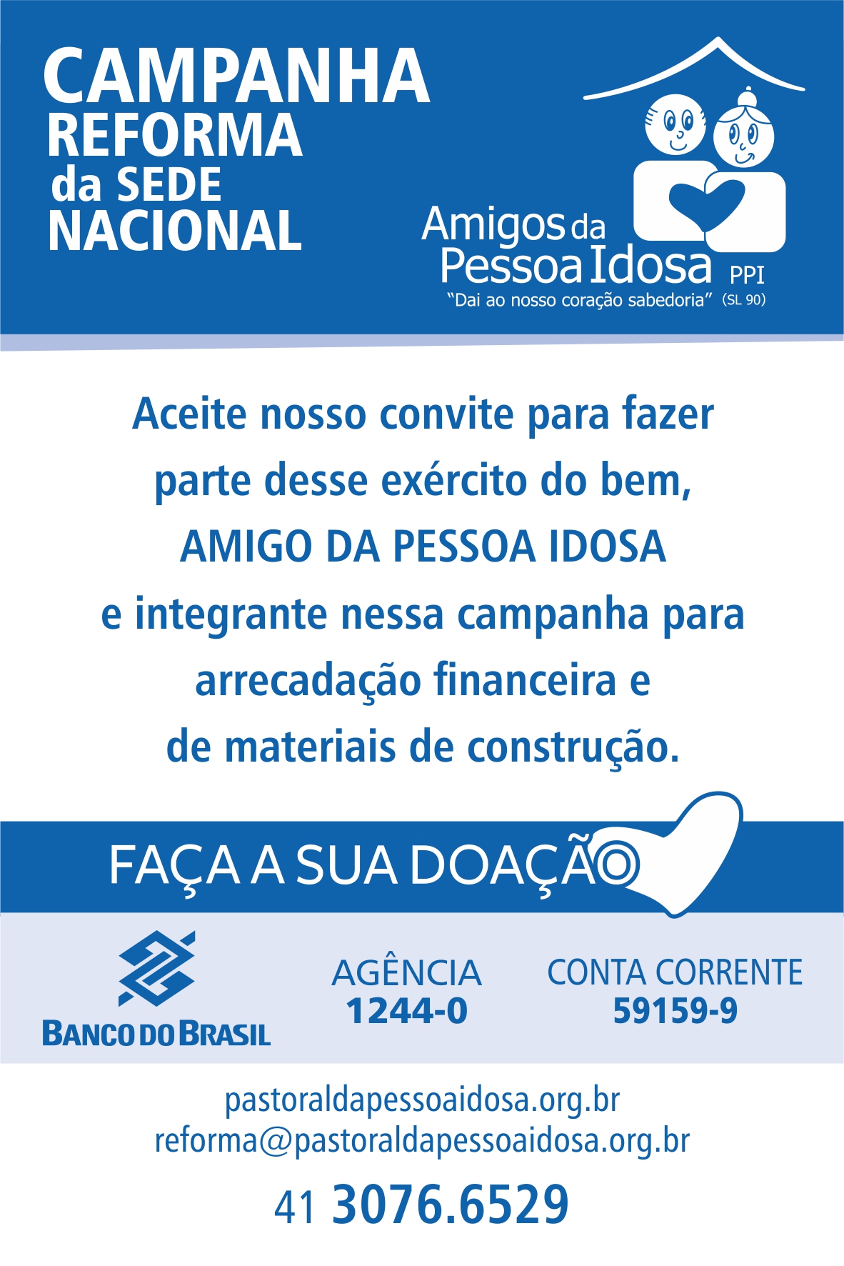 Com uma série de atividades previstas, a campanha de arrecadação para a reforma da Sede Nacional da Pastoral da Pessoa Idosa já começou. Hoje, a Coordenação Nacional da PPI funciona em um espaço emprestado, que comporta apenas sua parte administrativa, ficando o estoque de materiais de capacitação guardados em outro local, também emprestado.
